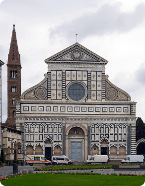 A Basílica de Santa Maria Novella é um dos principais complexos religiosos de Florença, iniciada no século XIII pela ordem dominicana. Sua fachada em mármore branco e verde, concluída no século XV segundo projeto de Leon Battista Alberti, tornou-se referência da arquitetura renascentista pela harmonia geométrica e pelo uso de proporções clássicas. No interior, a igreja abriga importantes obras de arte, como afrescos de Masaccio, Ghirlandaio e Filippino Lippi, além do célebre crucifixo de Giotto. O conjunto inclui ainda claustros, capelas e espaços monásticos que revelam a influência religiosa, artística e intelectual da ordem dominicana na história florentina.