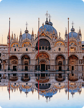 A Basílica de São Marcos é um dos monumentos religiosos mais importantes de Veneza, construída a partir do século XI para abrigar as relíquias do evangelista São Marcos, padroeiro da cidade. Sua arquitetura reúne influências bizantinas, românicas e orientais, refletindo as conexões comerciais da antiga República Veneziana com o Mediterrâneo. A fachada é marcada por cúpulas, arcos e ricos mosaicos dourados que também revestem amplamente o interior. A basílica conserva obras de grande valor simbólico como a Pala d’Oro, retábulo em ouro e pedras preciosas, e os célebres cavalos de bronze de Constantino associados às conquistas venezianas no Oriente. Integrada à Piazza San Marco, a basílica expressa o poder religioso, político e artístico que marcou a história da cidade.