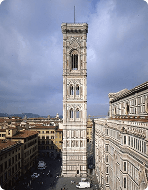 O Campanário de Giotto integra o conjunto monumental da Catedral de Santa Maria del Fiore, em Florença, e é considerado um dos mais belos exemplos do gótico italiano. Sua construção teve início em 1334 sob a direção do artista Giotto di Bondone, sendo posteriormente concluída por Andrea Pisano e Francesco Talenti. Revestida em mármore policromado branco, verde e rosa, a torre apresenta relevos escultóricos e painéis decorativos que representam temas bíblicos e alegóricos. Com cerca de 85 metros de altura, o campanário oferece uma vista ampla da cidade após a subida por suas escadas internas, destacando-se como elemento essencial do conjunto arquitetônico florentino.