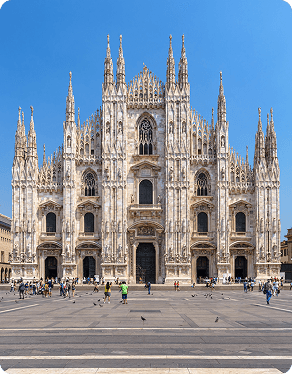 Localizado na principal praça da cidade, o Duomo de Milão é uma das maiores catedrais góticas da Europa e o principal símbolo religioso e arquitetônico milanês. Sua construção teve início em 1386 e se prolongou por quase seis séculos, reunindo diferentes estilos, técnicas e gerações de artistas e artesãos. Revestido em mármore branco-rosado proveniente da região de Candoglia, o edifício impressiona pelas centenas de pináculos, esculturas e vitrais que retratam passagens bíblicas, santos e personagens históricos. No ponto mais alto, a estátua dourada da Madonnina tornou-se um marco visual da cidade. O terraço, aberto à visitação, permite observar de perto os detalhes da arquitetura e a ampla paisagem urbana ao redor.