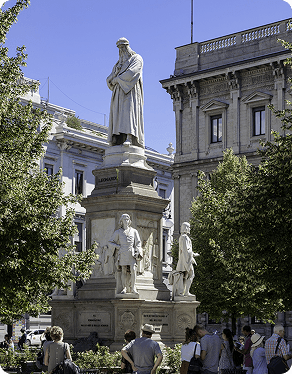 Situada no centro histórico de Milão, a Piazza della Scala organiza o espaço urbano entre o Teatro alla Scala, o Palazzo Marino e a Galleria Vittorio Emanuele II. A praça ganhou sua configuração atual no século XIX, acompanhando as transformações urbanísticas que modernizaram a cidade. No centro, destaca-se o monumento a Leonardo da Vinci, inaugurado em 1872 e cercado por esculturas de quatro de seus discípulos, celebrando a importância do artista e cientista para a cultura italiana e europeia. O conjunto arquitetônico ao redor reforça o caráter artístico e institucional do local, tornando a praça um ponto de passagem simbólico entre música, arte e vida pública milanesa.