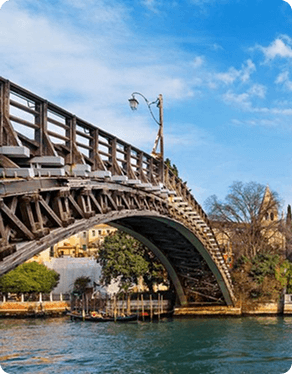 A Ponte dell’Accademia é uma das principais travessias sobre o Grande Canal de Veneza, conectando a região de San Marco ao bairro de Dorsoduro. Sua forma atual em madeira data de 1933, substituindo estruturas anteriores, e destaca-se pelo arco elegante que oferece uma das vistas panorâmicas mais conhecidas do canal. Próxima às Gallerie dell’Accademia, importantes para a arte veneziana dos séculos XIV ao XVIII, a ponte tornou-se ponto estratégico de circulação e observação da paisagem urbana. Apesar do caráter funcional, permanece como elemento simbólico do diálogo entre tradição, engenharia e preservação histórica na cidade.