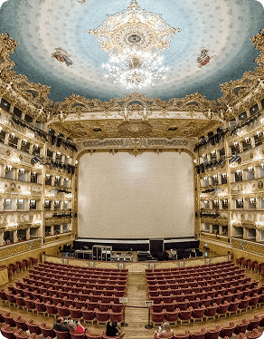 O Teatro La Fenice é uma das casas de ópera mais importantes da Itália e símbolo central da vida cultural de Veneza. Inaugurado em 1792, recebeu estreias de obras de compositores como Rossini, Bellini, Donizetti e Verdi, consolidando-se como referência internacional do repertório operístico. Ao longo de sua história, o edifício foi destruído por incêndios e sucessivamente reconstruído, mantendo o nome “La Fenice” — referência à ave mitológica que renasce das cinzas. Sua sala principal apresenta rica ornamentação neoclássica, com douramentos, camarotes e afrescos que preservam a tradição teatral italiana. Hoje, continua ativo com temporadas de ópera, concertos e balés, reafirmando o papel histórico de Veneza na música europeia.