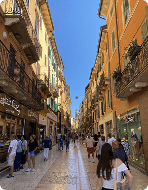 A Via Giuseppe Mazzini é uma das principais ruas do centro histórico de Verona, ligando a Piazza Bra à Piazza delle Erbe por um percurso predominantemente exclusivo para pedestres. Seu traçado segue antigas vias romanas que estruturavam a cidade, posteriormente adaptadas ao crescimento urbano medieval e moderno. Ao longo do tempo, a rua consolidou-se como eixo comercial, reunindo edifícios históricos com fachadas preservadas e estabelecimentos dedicados ao comércio e à moda. Atualmente, combina valor patrimonial com intensa circulação cotidiana, funcionando como importante corredor de ligação entre monumentos, praças e áreas culturais do núcleo veronês.