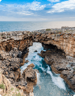 À beira-mar em Cascais, a Boca do Inferno é uma impressionante formação rochosa esculpida pela força das ondas do Atlântico. O nome dramático vem do som e do espetáculo das águas que, ao entrarem nas fendas da falésia, explodem em jatos de espuma, lembrando um rugido poderoso. No século XIX, o local já era atração para viajantes e artistas, incluindo o famoso ilusionista Aleister Crowley, que aqui encenou o seu desaparecimento em 1930. Além da curiosidade histórica, a paisagem é de tirar o fôlego, principalmente ao pôr do sol, quando o mar e o céu se encontram em tons dourados e avermelhados. É um lugar que mistura beleza natural e misticismo, símbolo da eterna luta entre a terra e o oceano.