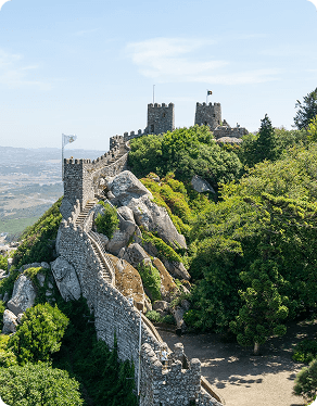 Encravado na serra de Sintra, o Castelo dos Mouros remonta ao século VIII, quando foi erguido pelos árabes como fortificação estratégica para vigiar a região. Suas muralhas sinuosas, que se estendem pela montanha, oferecem hoje algumas das vistas mais deslumbrantes de Sintra, abrangendo o Palácio da Pena, o Atlântico e até Lisboa em dias claros. Embora em ruínas, conserva torres, passagens e troços de muralha que evocam séculos de batalhas e reconquistas. Caminhar por seus parapeitos é sentir o peso da história medieval, entre pedras antigas e o sopro do vento que conta segredos de conquistas, resistências e da longa presença islâmica em Portugal.
