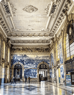 Inaugurada em 1916, a Estação de São Bento é muito mais do que um ponto de partida e chegada de comboios: é um verdadeiro monumento artístico do Porto. Construída no local de um antigo convento beneditino, a estação encanta sobretudo pelo seu átrio revestido com mais de 20 mil azulejos pintados por Jorge Colaço. Esses painéis azuis e brancos narram episódios marcantes da história de Portugal, desde batalhas medievais até cenas do quotidiano rural. A sua arquitetura, de estilo francês Beaux-Arts, alia grandiosidade e elegância, transformando o espaço num dos locais mais fotogénicos da cidade. Visitar São Bento é viajar não apenas pelo país nos trilhos do comboio, mas também pelo tempo e pela memória cultural portuguesa.