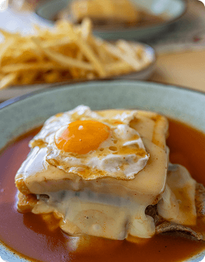 A francesinha é o prato mais icônico do Porto e uma verdadeira explosão de sabores. Inspirada no croque-monsieur francês, foi criada nos anos 1950 por um emigrante português que adaptou a receita ao gosto local. O sanduíche é montado com camadas de pão, bife, linguiça, salsicha e presunto, coberto por queijo derretido e regado com um molho espesso e picante, cuja receita varia de casa para casa e é guardada a sete chaves. Tradicionalmente, é servido com batatas fritas e, muitas vezes, coroado por um ovo estrelado. Mais do que um prato, a francesinha é uma experiência gastronômica intensa, símbolo da generosidade e do espírito acolhedor do Porto.