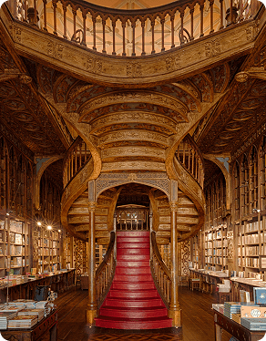 No coração do Porto, a Livraria Lello é um dos templos literários mais belos do mundo. Inaugurada em 1906, encanta visitantes com sua fachada neogótica e, sobretudo, com o interior deslumbrante: estantes de madeira talhada, vitrais coloridos e a icônica escadaria vermelha em curvas elegantes, que parece saída de um sonho. Frequentada por intelectuais e escritores, a Lello ganhou fama internacional por ter inspirado cenários mágicos em livros de fantasia, embora esse mito nunca tenha sido confirmado. Ainda assim, entrar na livraria é como atravessar a porta de um universo encantado, onde cada detalhe celebra a paixão pelos livros e pela imaginação. Um lugar onde a literatura se transforma em pura arte.