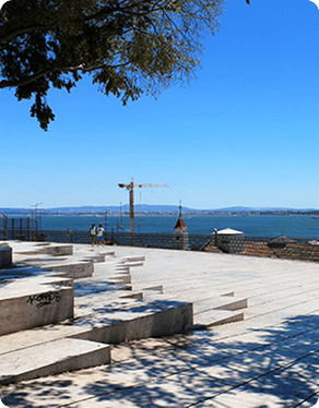 Conhecido carinhosamente como “Adamastor” pelos lisboetas, o Miradouro de Santa Catarina é um dos pontos de encontro mais descontraídos da cidade. A estátua do mítico gigante das navegações, inspirada em Os Lusíadas de Camões, dá personalidade ao local, que se abre para uma vista ampla sobre o Tejo, o porto e a Ponte 25 de Abril. Ao entardecer, o espaço ganha uma atmosfera vibrante, com músicos de rua, jovens reunidos nos degraus e o sol tingindo o céu em tons dourados. Ao redor, cafés e esplanadas complementam o cenário, transformando este miradouro num lugar onde história, mitologia e vida boêmia se misturam em perfeita harmonia.