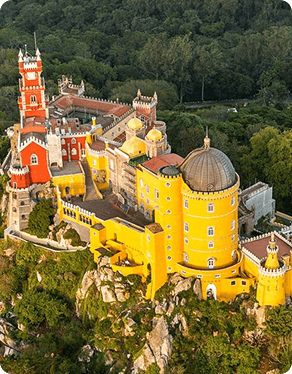 Erguido no topo da serra de Sintra, o Palácio da Pena parece saído de um conto de fadas, com suas torres coloridas, muralhas e cúpulas que misturam estilos gótico, manuelino, renascentista e mourisco. Construído no século XIX por ordem de D. Fernando II, é um dos mais emblemáticos exemplos do romantismo europeu. Sua fachada amarela e vermelha destaca-se entre o verde da serra, criando uma imagem mágica visível até de Lisboa em dias claros. O interior preserva ambientes luxuosos e exóticos, enquanto os jardins que o rodeiam são um labirinto de trilhas, lagos e espécies botânicas vindas de todo o mundo. Declarado Patrimônio Mundial pela UNESCO, o Palácio da Pena é símbolo máximo do encanto e da fantasia que tornam Sintra única.