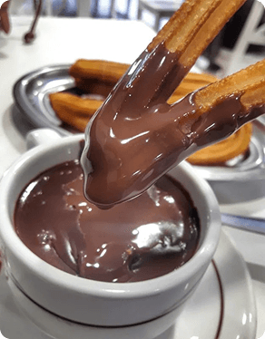 Servidos repletos de açúcar e canela, são mergulhados em um chocolate quente espesso, quase cremoso, que transforma cada mordida em puro conforto. Em Madri, é tradição saboreá-los nas chocolaterías, especialmente depois de uma noite longa ou durante o café da manhã. Mais do que um doce, é um ritual espanhol de aconchego e convivência.