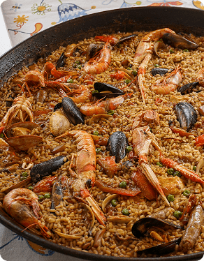 Originária da região de Valência, a paella é um dos pratos mais emblemáticos da culinária espanhola. Seu nome vem da ampla frigideira onde é preparada, e cada camada de arroz dourado conta um pedaço da história mediterrânea. Tradicionalmente feita com arroz, frango, coelho e feijão-verde, a versão original — a paella valenciana — reflete as raízes rurais da região.