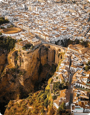 Suspensa sobre um desfiladeiro de 120 metros de profundidade, Ronda é uma das cidades mais espetaculares da Andaluzia, fundada pelos celtas e desenvolvida pelos mouros. O símbolo máximo da cidade é a Puente Nuevo, ponte monumental do século XVIII que liga as duas partes de Ronda sobre o Tajo de Ronda, oferecendo vistas vertiginosas do vale abaixo. O centro histórico, conhecido como La Ciudad, guarda vestígios árabes, como as antigas muralhas e os Baños Árabes, além da Iglesia de Santa María la Mayor, construída sobre uma antiga mesquita. Outro destaque é a Plaza de Toros, uma das arenas de touradas mais antigas e elegantes da Espanha, datada de 1785. Cercada por montanhas e oliveiras, Ronda inspirou escritores como Ernest Hemingway e Orson Welles, que viram nela a essência romântica da Andaluzia — uma cidade onde a natureza e a história se equilibram, literalmente, à beira do abismo.