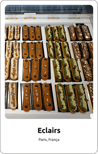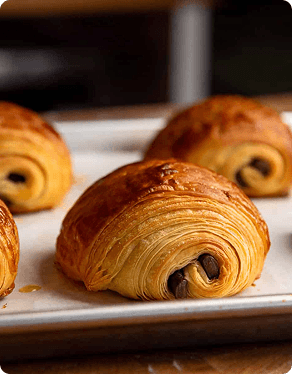 Irmão do croissant, o pain au chocolat é uma das estrelas da viennoiserie francesa. Feito com a mesma massa folhada amanteigada, sua diferença está no recheio: duas barrinhas de chocolate que derretem durante o forno e criam um contraste perfeito entre a leveza da massa e a intensidade do cacau. Originário também da influência austríaca no século XIX, ele ganhou o coração dos parisienses e se tornou presença indispensável nos cafés da manhã e lanches. Crocante por fora, macio por dentro, é o tipo de delícia simples que traduz o prazer de viver à moda francesa.