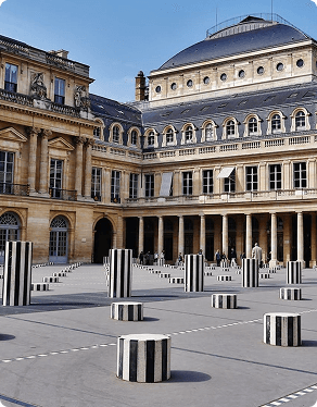 A poucos passos do Louvre, o Palais Royal combina história, arte e tranquilidade no coração de Paris. Construído no século XVII como residência de cardeais e reis, seus jardins e galerias se transformaram ao longo do tempo em um dos centros da vida parisiense. Hoje, o pátio interno abriga a famosa instalação de colunas listradas de Daniel Buren, que contrasta de forma lúdica com a arquitetura clássica. Já os jardins, cercados por arcadas elegantes, oferecem um refúgio silencioso da agitação da cidade, onde parisienses e visitantes descansam à sombra das árvores.