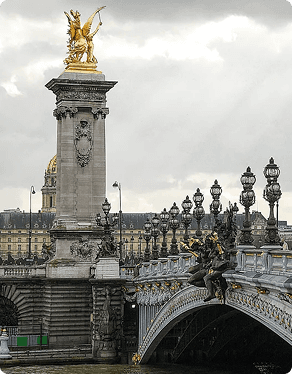 A Ponte Alexandre III é, sem dúvida, a mais elegante de Paris. Inaugurada em 1900 para a Exposição Universal, liga os Invalides ao Grand e Petit Palais em um espetáculo de arte e engenharia. Com seu arco único em aço e ornamentações ricas, a ponte é adornada por estátuas douradas de ninfas, querubins e cavalos alados que brilham sob a luz do sol. À noite, seus postes de luz transformam a travessia em um cenário de conto de fadas, refletido nas águas do Sena. Mais que um caminho, é um convite para contemplar Paris em sua versão mais romântica e majestosa.